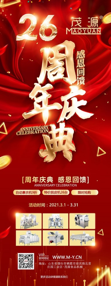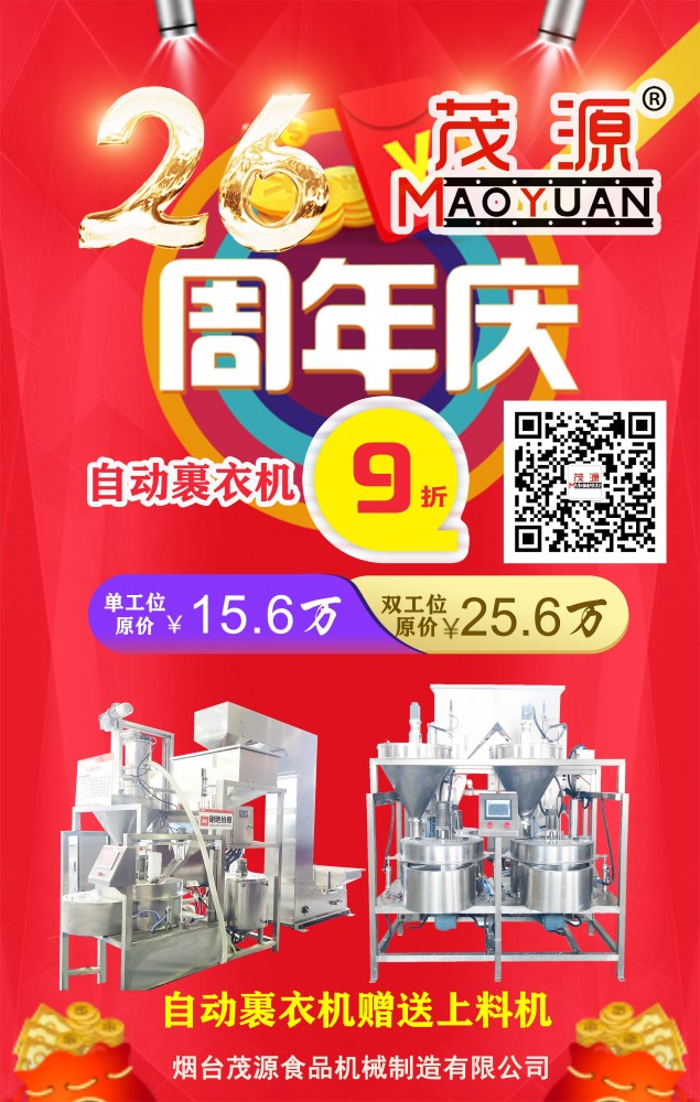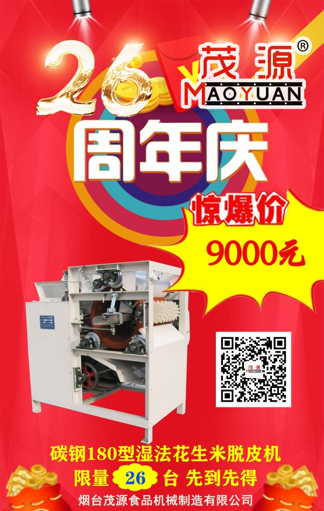煙台涩涩人成(yuán)食品機械即將迎來26周年慶,為感謝新老客戶長期(qī)以(yǐ)來(lái)的支持與信任,現特推出以下感恩回(huí)饋活動:單工位、雙工位自動裹衣(yī)機(jī)原(yuán)價15.6萬元、25.6萬元基礎上降(jiàng)價10%,並隨機贈上料機;碳鋼(gāng)180型濕法花生米脫皮機特價9000元(yuán),限量26台(tái),先到先得!