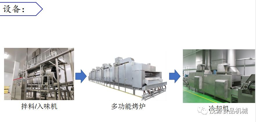 簡易(yì)型:原料(liào)→裹衣→烘烤(kǎo)→拌料(liào)→烘(hōng)幹→冷卻→包裝
