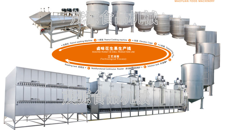 鹵味花生果生(shēng)產線主要由:洗果機、煮鍋、吊籠、入味鍋、料液罐、多功(gōng)能連續烘烤爐,以及烘烤(kǎo)池等設備組成。