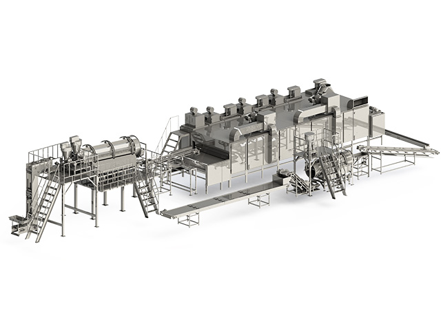 簡介:采用噴淋、塗層、鍍膜工藝及多層調味技術,從溶液、前粉、後粉三部分來進(jìn)行調味,產品口感更加豐富立體。裹衣單(dān)元中噴淋設(shè)備內部獨特的結構,大大提(tí)高(gāo)了原輔料的接觸機會,裹衣效果更加均(jun1)勻,降低了產品的次品率。堅果仁原料以及半(bàn)成品通過傳送帶運輸,依次經過提升(shēng)機進入主要加工設備——連續式淺粉塗(tú)裹設備,然後進行油炸/烘烤,進行二次裹粉(fěn)調味後再進入冷(lěng)卻,再進行包裝,全自動化連續作業提高生產效率,保證(zhèng)產品品質。